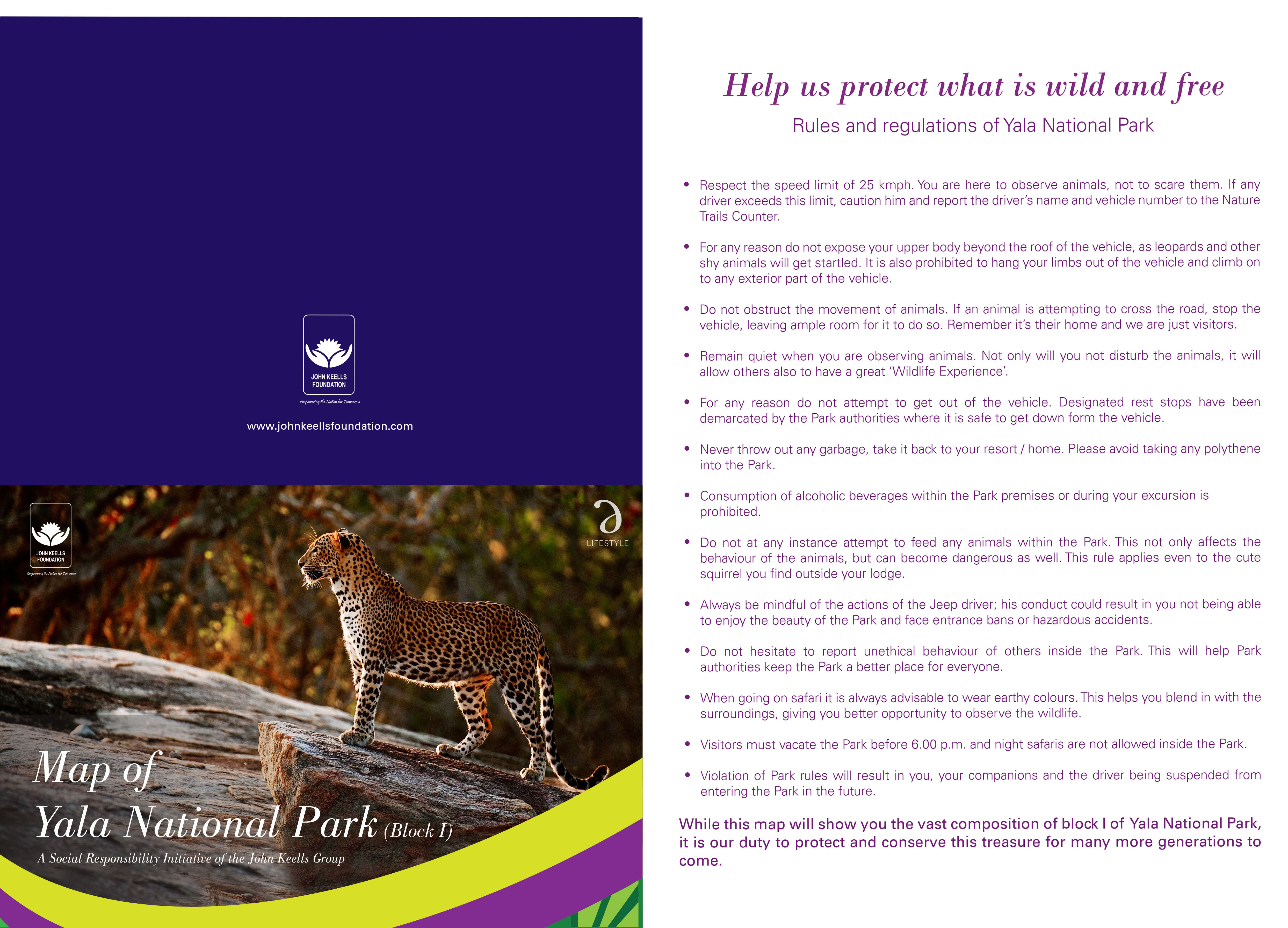 The Yala National Park is the second largest and arguably the most popular National Wildlife Park in Sri Lanka with over 100,000 visitors a year. Due to the popularity of the park as a destination for leopard sightings, visitation to Yala, by both local and foreign tourists, has been on the increase, especially after the end of the thirty-year civil conflict. However, even with visitation and attention to Yala on the increase, there still is a lack of correct information and guidance to the Park visitors which is an important part of visitor experience. Therefore, Cinnamon Nature Trails together with John Keells Foundation initiated a new project during the reporting year to develop the map of the Yala National Park as an initial step to educate Park visitors on various aspects including the map of Yala Block I, information about the Park and visitor responsibilities on entering the Park. 15,000 copies of the map were printed, and will be made available to guests at Cinnamon Wild Yala. A few maps were also distributed to park officials.